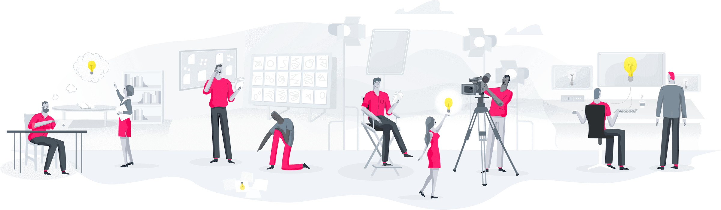 This image was created as a hero image for StudioBinder.com. The idea was to express the breadth of StudioBinder’s versatility by showing the entire process from idea conception to editing. I used a mostly grey palette with a yellow lightbulb to represent the idea, and StudioBinder’s brand magenta.